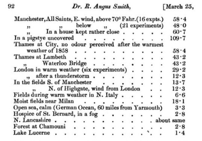 Carbon dioxide was only one contaminant of the air. Robert Angus Smith lectured in 1859 On the Estimation of the Organic Matter of the Air, a few months after the climactic Great Stink of 1858 when feculent fumes from the Thames drove MPs from parliament.